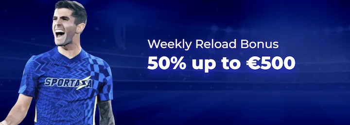 Players using our Sportaza promo code also qualify for a weekly sports reload: 50% up to €500 on the first deposit made between Monday and Sunday.