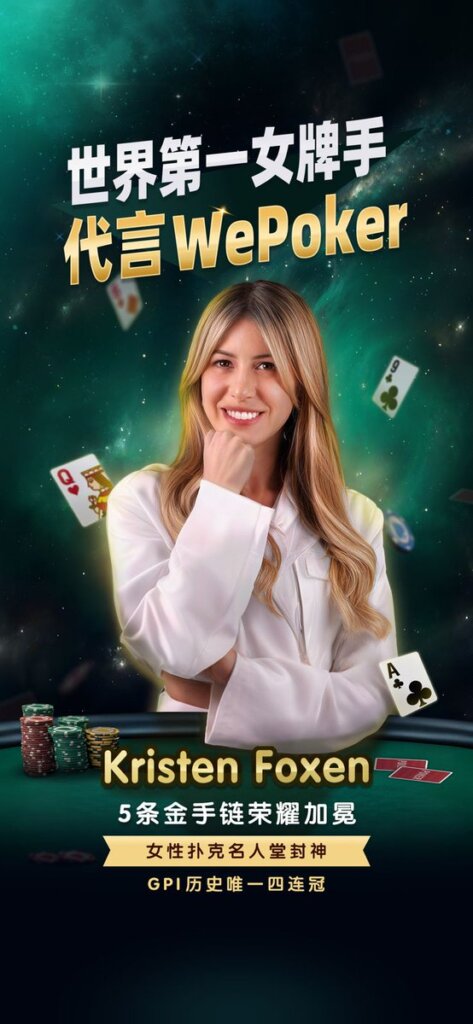Foxen, inducted into the Women in Poker Hall of Fame (WiPHoF) last year, is the new face of Asian-facing site WePoker. As pointed out elsewhere, Kristen’s photo looks to have been touched up, perhaps to reflect her new market.