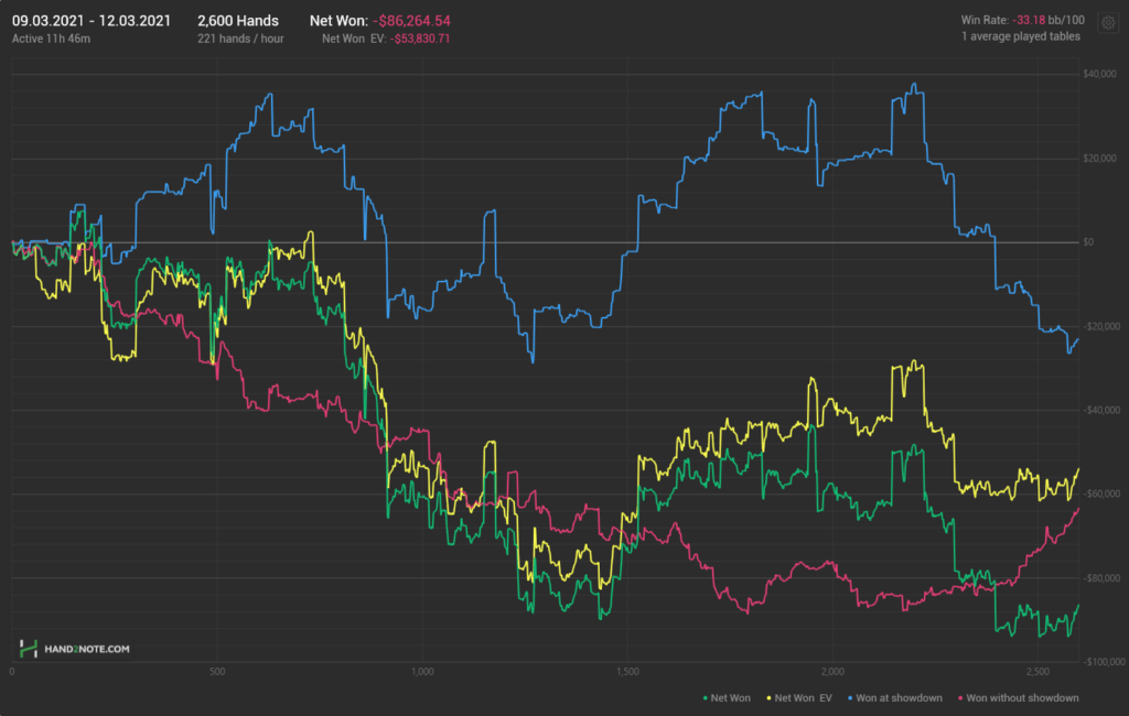 As you can see from the graph, the sessions took place between March 9 – 12. Wiktor ran pretty well as you can see from Burakov’s All-In Chip EV, which is only -$53,830.71, while he ended up losing $86K.