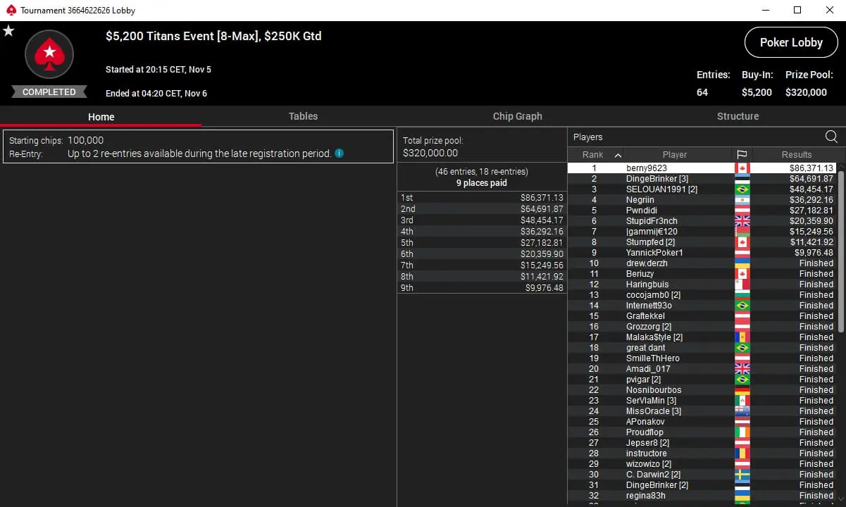 The PokerStars Titans Event is the most prestigious weekly online tournament and last night it had a surprise winner with unknown player “berny9623”.