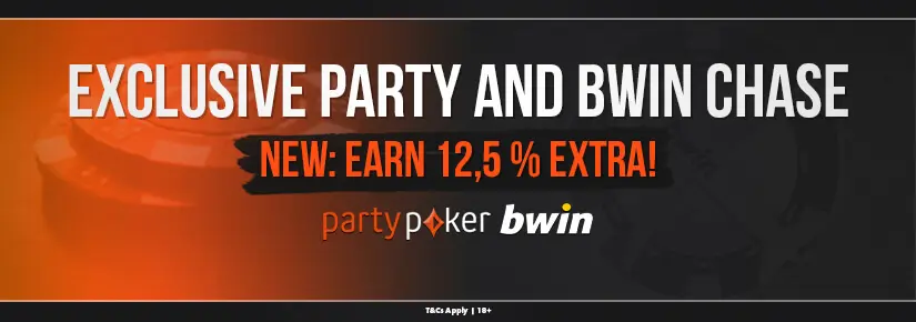 Note: You will get up to 12,5 % gross extra value on top of all other partypoker or Bwin promotions. Diamond Club players and players who deposited the first time 3+ years ago (old accounts) are excluded from our chase.