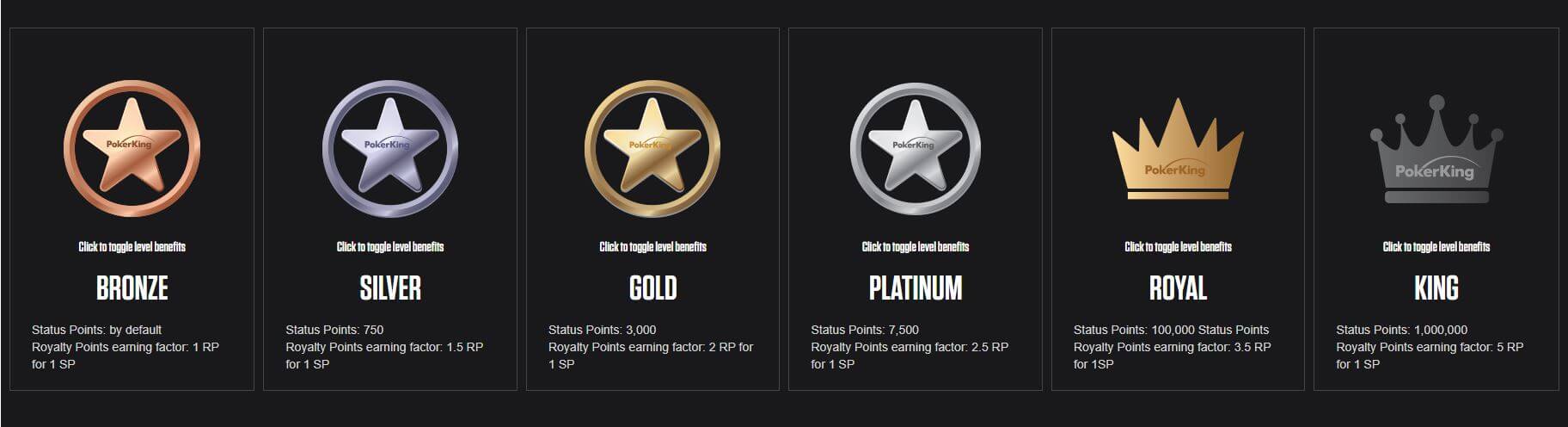 PokerKing members start with a Bronze Crown and will start earning points right away by playing at the tables. By reaching new levels in the PokerKing Rakeback system called Royal Club, you will be earning more points which equals higher rewards.