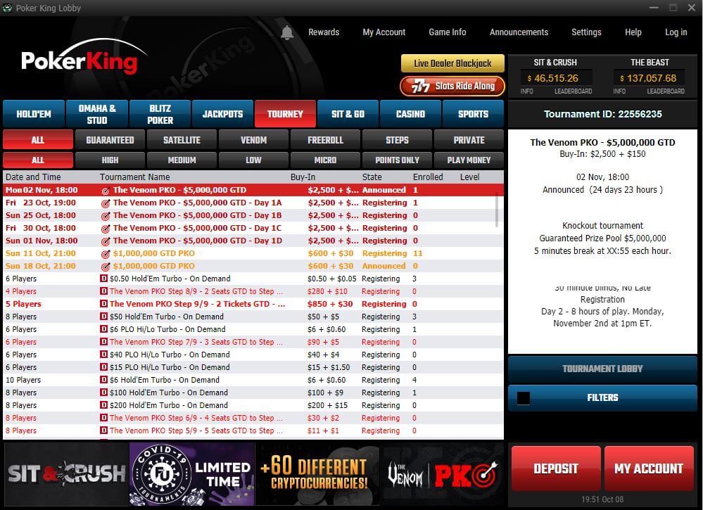 PokerKing is a reliable poker site offering great cash game and tournament traffic and a wide variety of games 24/7.